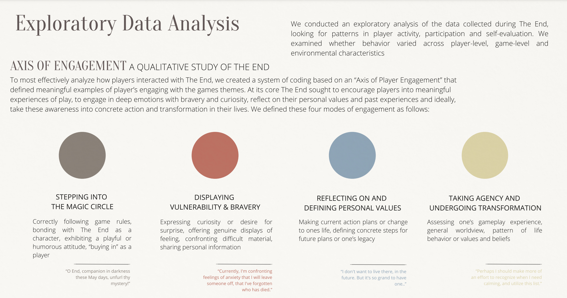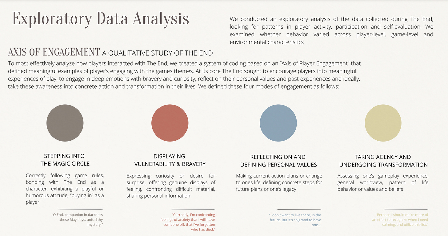 The team behind The End did this masterfully, using research not just as a starting point, but as a guiding force throughout the entire design process. In addition to content specifically about death and dying, the team researched other areas including game design, different genres of gameplay, interactive theater works that could provide inspiration, and simulation-based learning. If you’re curious, everything is compiled here.