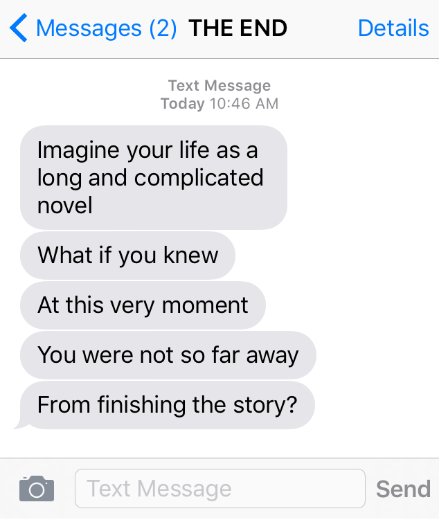 I believe the central thing that made The End successful, particularly as an experiment in storytelling, was the way it required this authorship of its audience. The content of the piece IS them and is played as users are living their lives, potentially allowing any moment’s thought or action to become part of a larger narrative thread we explored over the month. Adrienne Mackey, —Director and Lead Writer