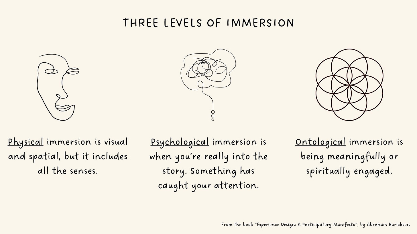 There are three levels of immersion (and they are often stacked): physical, psychological, and ontological.