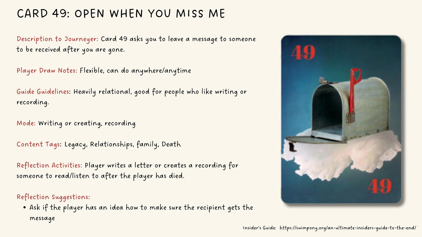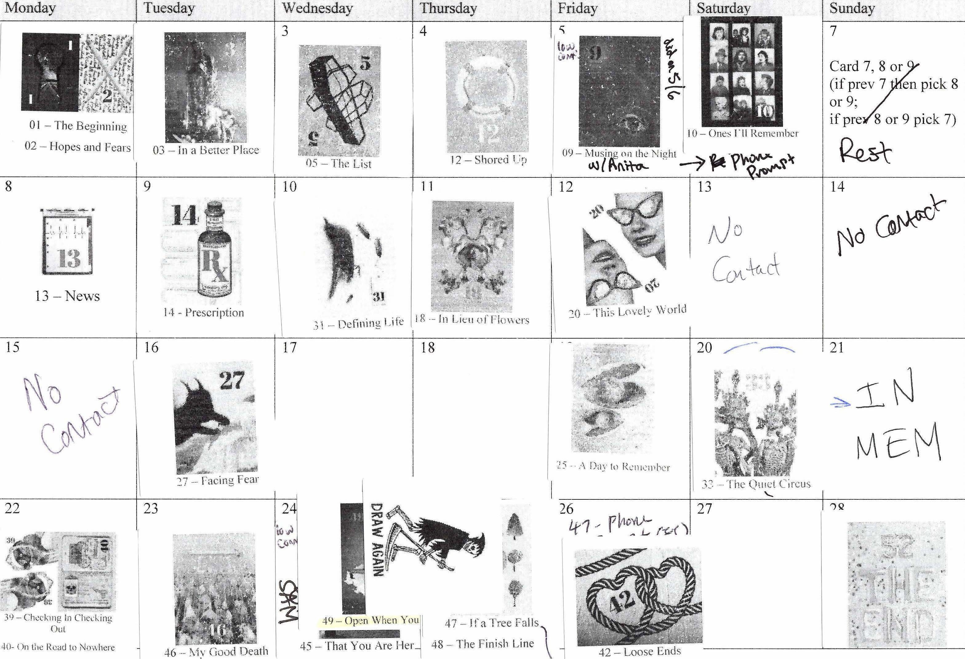In the final week, players turn reflection into action, applying their experiences to real-life decisions. Cards in this week include taking a first step to resolve lingering regrets from the past, or articulating the specifics of what a final legacy might be.