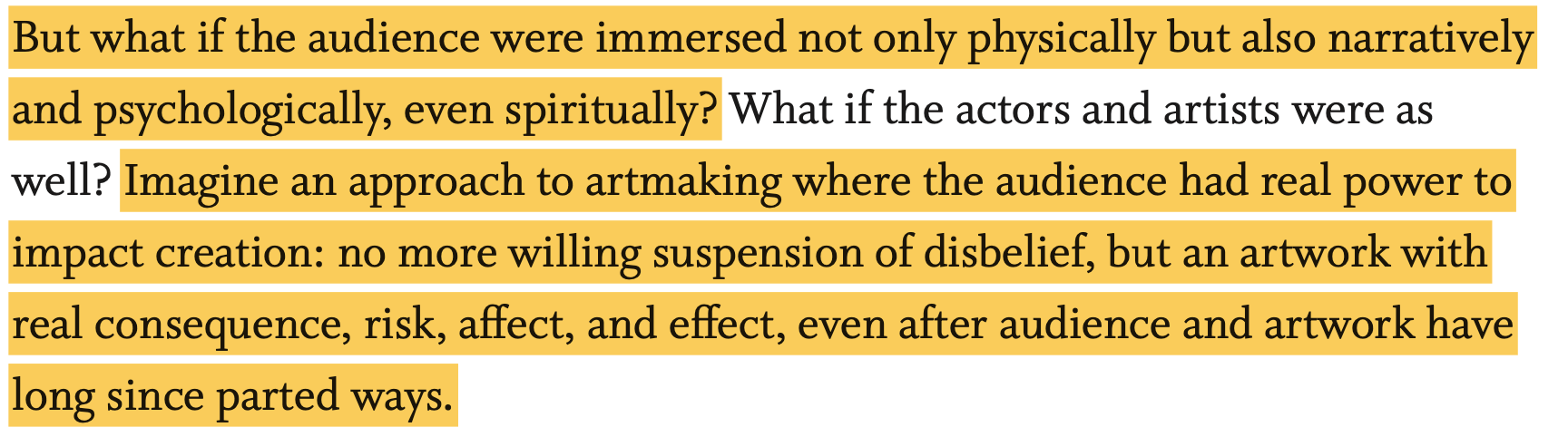 For an experience to have impact, it must be not only physically immersive, but also psychologically immersive. For it to really matter, it must be ontologically immersive as well […] it must resonate with an audience’s sense of meaning.