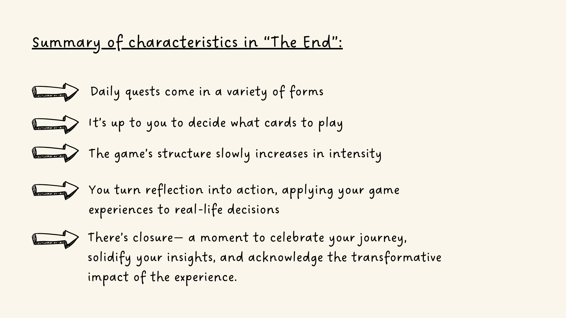 The End is a contemplative game that imagines how we live differently when we are consciously aware we will die […] It is an opportunity to engage in examinations of our fears about mortality, to become brave in the face of them, and by thinking about what is wanted out of life, fully make the most of the time we have.