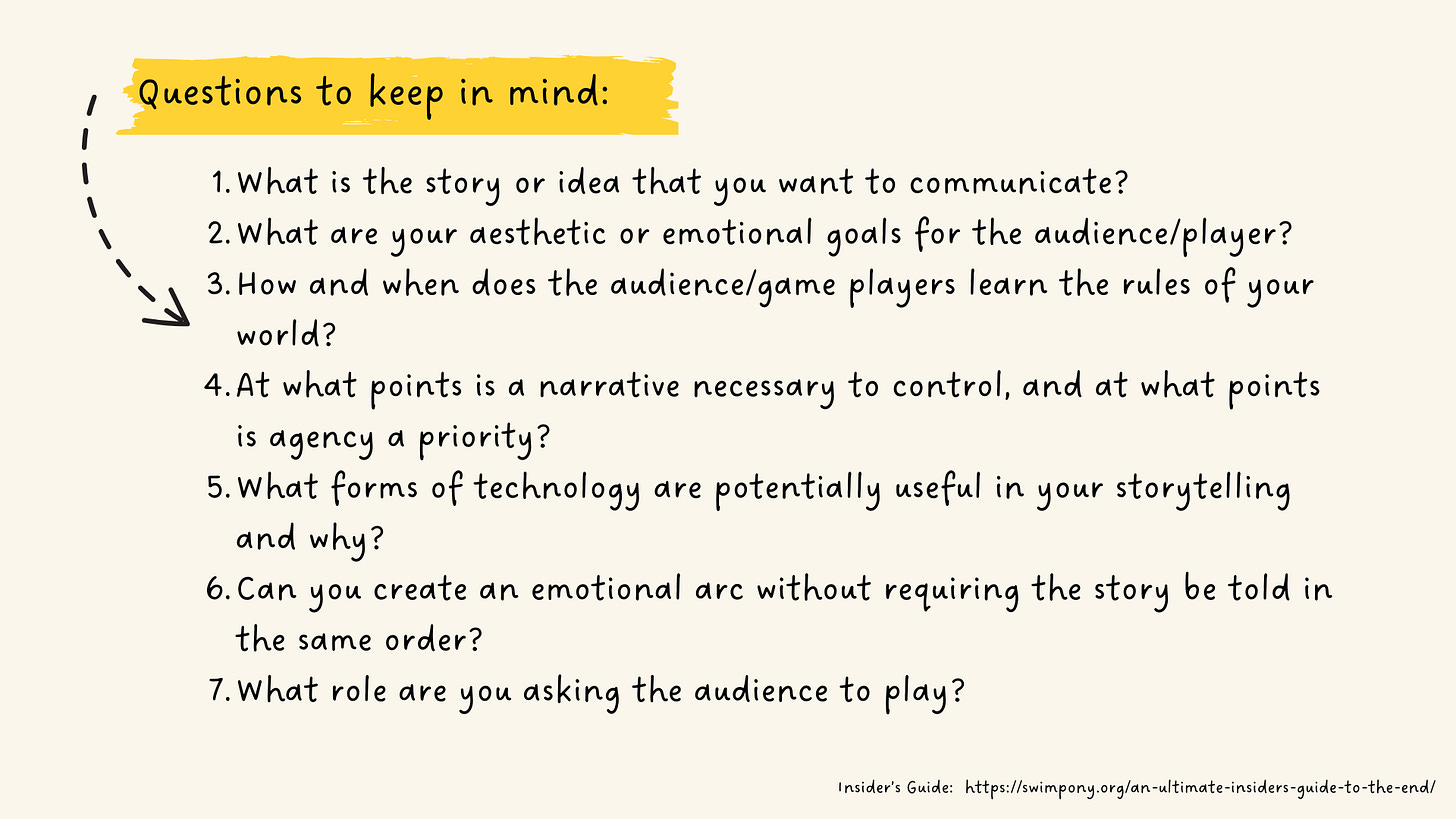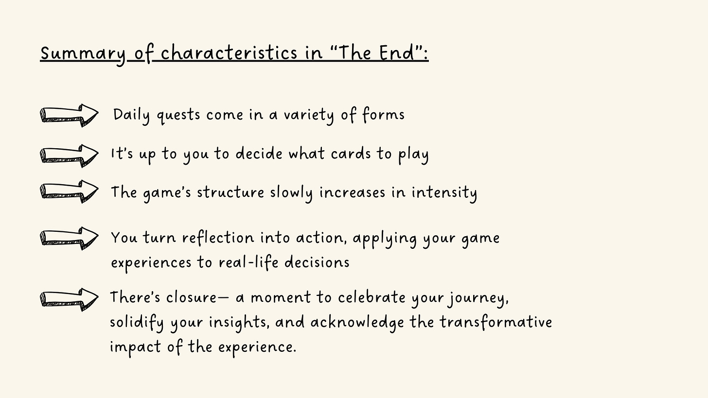 What I like the most about this format is the way it blends different disciplines and art forms all at once. There’s a lot of game design in it: feedback loops, aesthetics, rules, agency, personalization, narrative… There’s also a lot of the learning elements we’ve explored before in this newsletter: active quests, choosing your own adventure, scaffolding, real-life experiences, and reflecting through conversation.