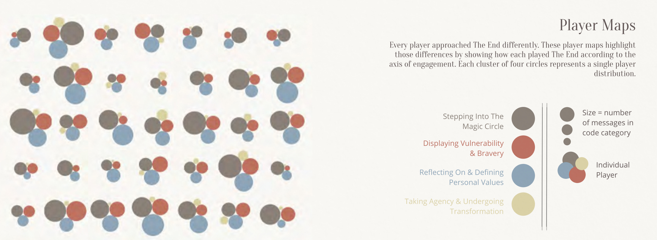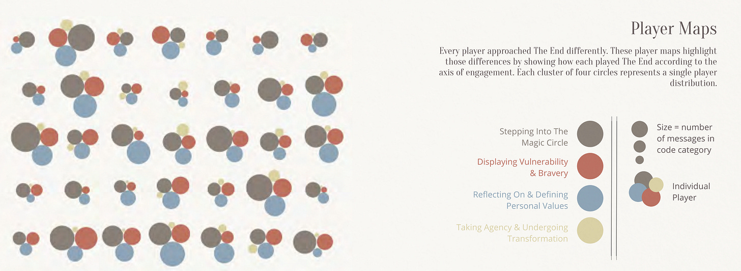 The team also generated an archive of knowledge about players emotional state throughout the month of play, reflective quotes about their experience, metrics on the piece’s psychological impact, demographical basics about their lives, metrics about their messaging styles and timing, response to various cards throughout gameplay… the list goes on and on. This is particularly interesting because a common question when designing learning experiences usually is: ‘how do I measure success?’ (It’s probably not a matter of open rates or subjective metrics of ‘engagement’).